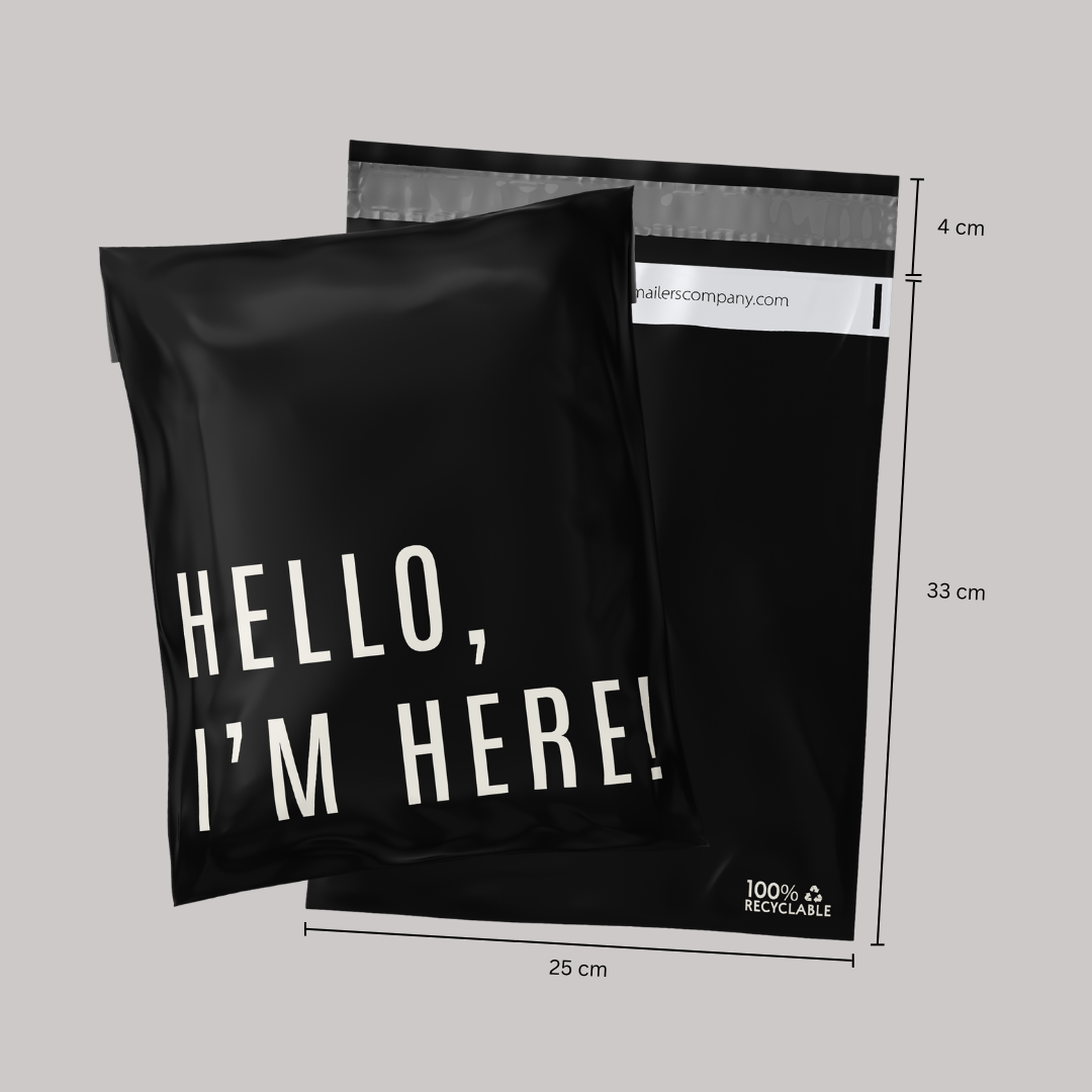 Bolsa de envío 25x33 cm | Hello I'm Here Black – Pack 100 piezas